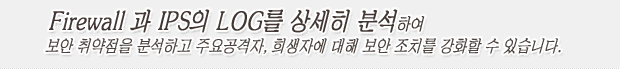 ¿ÜºÎÀÇ °ø°ÝÀ» Firewall °ú IPS ±â´ÉÀ» ÅëÇØ ¹æ¾îÇÑ °á°ú¿¡ ´ëÇØ °í¼ÓÀÇ µ¥ÀÌÅÍ ¼öÁý ¹× DBó¸® ±â¼úÀ» ÀÌ¿ë, Àü¹® ±â¹ýÀ¸·Î ºÐ¼®ÇÑ ¼ö¹é¿©Á¾ÀÇ ´Ù¾çÇÑ ÀڷḦ ½Ç½Ã°£À¸·Î Á¦°øÇÕ´Ï´Ù. |
