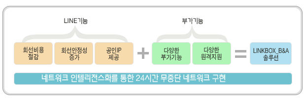 LINKBOX_B&A ¼Ö·ç¼ÇÀÇ LINE ±â´ÉÀ̶õ °í°¡ÀÇ ±â¾÷ Àü¿ëȸ¼± ´ë½Å Àú°¡ÀÇ xDSL ȸ¼± ¿©·¯°³¸¦ ÅëÇÕÇÏ¿© Àü¿ë¼±°ú °°ÀÌ ±¸¼ºÇÑ »õ·Î¿î °³³äÀÇ ÀÎÅÍ³Ý È¸¼±À» Á¦°øÇÏ´Â ±â´ÉÀ¸·Î ºñ¿ëÀº ÁÙÀÌ°í ¼Óµµ¿Í ¾ÈÁ¤¼ºÀº ´õ¿í Çâ»ó ½ÃŲ »õ·Î¿î °³³äÀÇ È¸¼± Á¦°ø ±â´ÉÀÔ´Ï´Ù. |