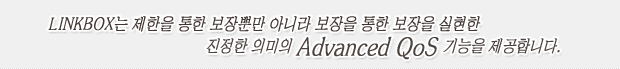 LINKBOXÀÇ QoS ±â´ÉÀº Á¤È®ÇÑ ´ë¿ªÆø Á¦¾î´É·Â, ÀÔüÀûÀÎ 3Â÷¿ø Á¤Ã¥ ¼³Á¤, º¸ÀåÀ» ÅëÇÑ º¸Àå½ÇÇö, ´Ù¿î·Îµå Æ®·¡ÇÈ¿¡ ´ëÇÑ ´ë¿ªÆø Á¦¾î µî ¿©·¯ Â÷º°È­µÈ ±â´ÉÀ» ÅëÇØ ´Ü¼ø QoS°¡ ¾Æ´Ñ ÁøÁ¤ÇÑ ÀǹÌÀÇ Advanced QoS ±â´ÉÀ» Á¦°øÇÕ´Ï´Ù.